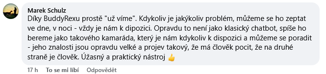 Všechna vaše data jsou plně chráněna šifrováním a zůstávají pouze mezi vámi a BuddyRexem. Vaše konverzace nejsou využívány pro další trénink systému.